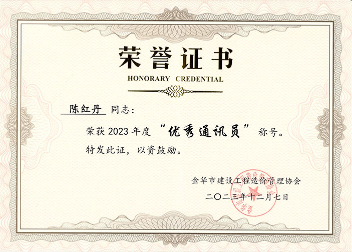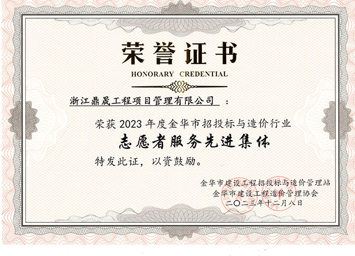 会上对“2023年度新闻宣传优秀单位”和“优秀通讯员”、2023年度金华市招投标与造价行业志愿者服务先进集体进行通报表彰。我公司荣获“2023年度志愿者服务先进集体”称号,陈红丹获得优秀通讯员荣誉。